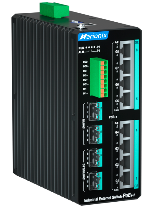 Управляемый промышленный Full Gigabit Ethernet коммутатор 2 уровня, 8 x 1G RJ45 PoE++, 2 x 1G SFP, 2 x 2.5G SFP, 2 x DI, 2 x DO, общий PoE бюджет 360W, питание 2 x 50~55VDC, монтаж на DIN-рейку